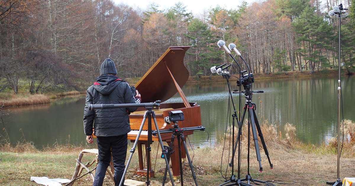 千代田湖の静寂の中では、わずかなペダル音や演奏者の呼吸さえも、自然の鼓動と共振する重要なピースとして美しく立ち上がります。完成したサウンドは、透明感のあるピアノの旋律を、遠くでさえずる鳥の声や木々のざわめきがオーケストラのように支える、奇跡的なバランスの仕上がりです。