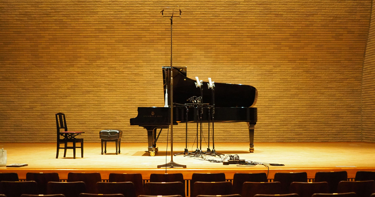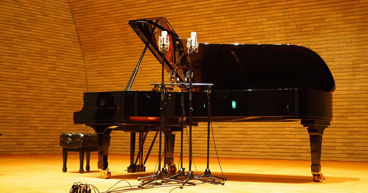 今回のプロジェクトの舞台は、優れた音響特性で知られる「長野県塩尻市レザンホール(中ホール)」です。 総席数392席という室内楽やリサイタルに最適なスケール感、そして空席時で約1.4秒という極めて音楽的で美しい残響特性を持つこのホールは、ピアノソロのレコーディングにおいて、ホールの持つ豊かな響きと静寂が「楽器の一部」として機能します。