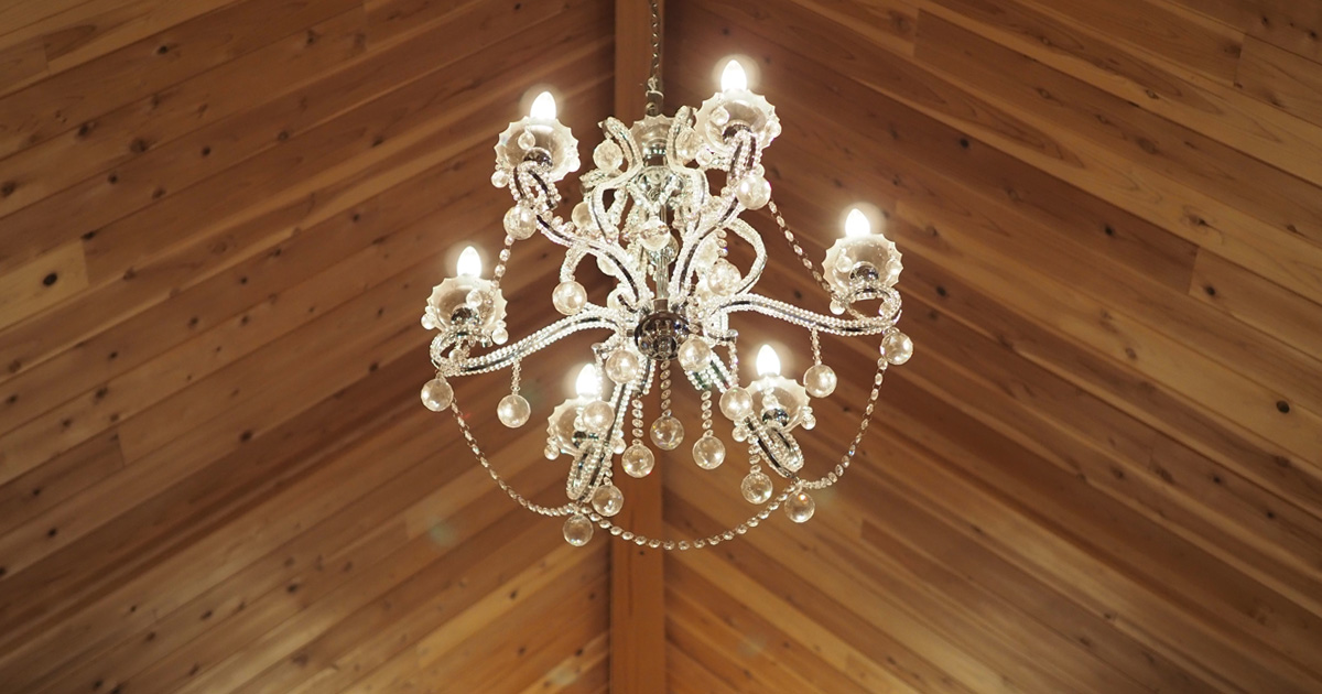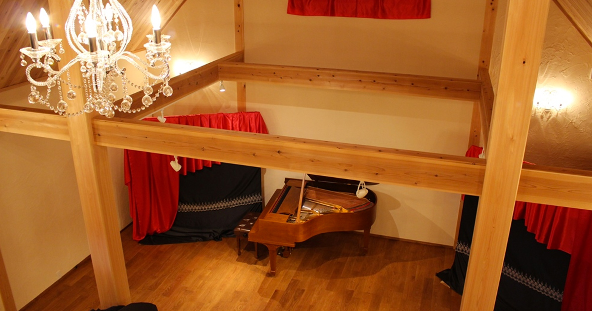 ホール内に一歩足を踏み入れれば、まず目を引くのが木曽東濃檜の8寸角(約24cm角)という堂々たる大黒柱。高さ6.5mのダイナミックな吹き抜け空間と、優美なシャンデリアが吊るされた金勾配の天井が、室内楽に理想的な初期反射と豊かな残響をもたらします。